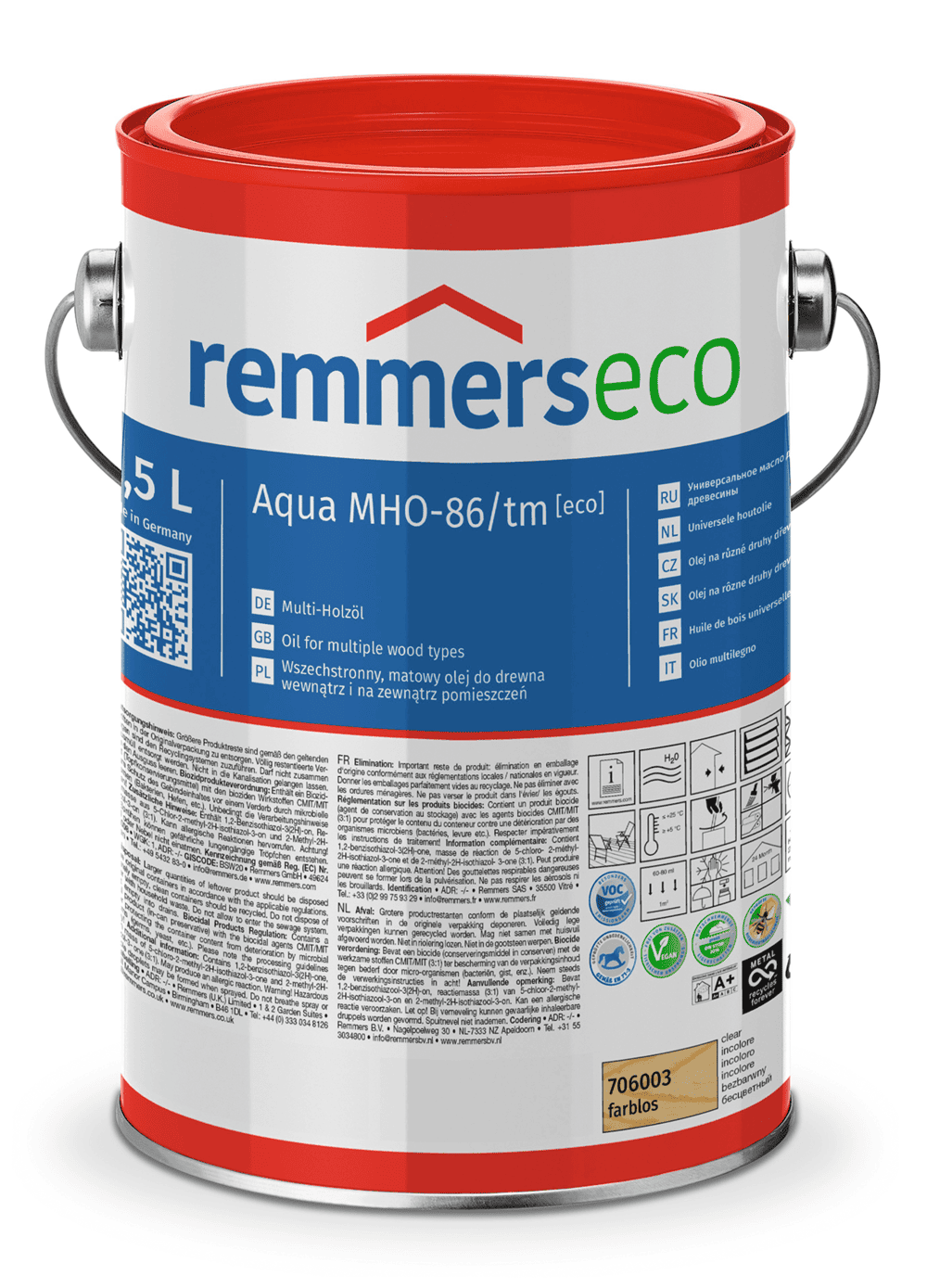 De Remmers Aqua MHO-86/tm Universele Houtolie [ECO] is een krachtige en duurzame bescherming voor hout binnen én buiten. Remmers Aqua MHO-86/tm Universele houtolie Eco is een watergedragen, matte olie op basis van plantaardige oliën, speciaal ontwikkeld voor houten bouwonderdelen met beperkte tot geen maatvastheid (denk aan schuttingen, gevelbekleding, tuinmeubelen, terrasplanken). Dankzij de innovatieve samenstelling combineert hij een natuurlijke uitstraling met hoogwaardige bescherming.